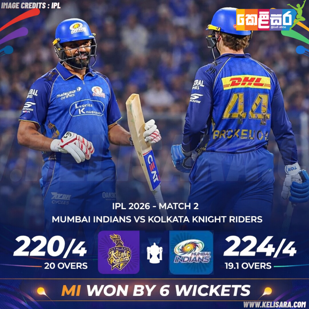 In Match 2 of the Indian Premier League 2026, Mumbai Indians pulled off a sensational run chase to defeat Kolkata Knight Riders by 6 wickets, chasing down 221 with five balls to spare.