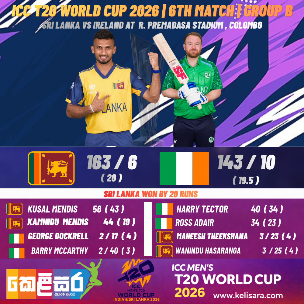 Batting first, Sri Lanka posted 163/6, thanks to a solid innings from Kusal Mendis and an impactful late cameo from Kamindu Mendis (44 off 19). Ireland’s chase never fully got going, finishing 143/9 despite efforts from Ross Adair and company. Spinners Maheesh Theekshana and Wanindu Hasaranga played crucial roles with the ball to restrict the Irish batting lineup.