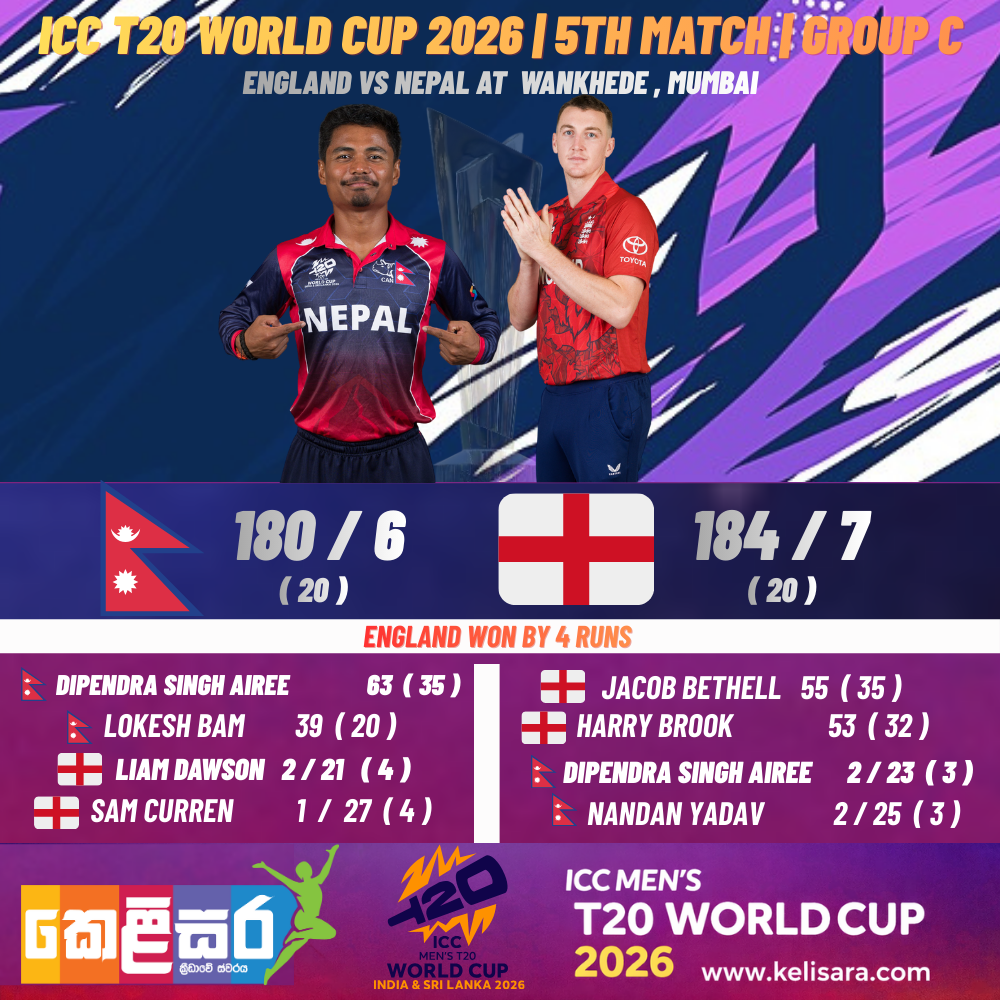 England survived a late scare to beat Nepal by 4 runs in a gripping Group C encounter at Wankhede Stadium, Mumbai. England posted 184/7, powered by Jacob Bethell (55) and Harry Brook (53) after an early collapse left them struggling at 57/3. Will Jacks provided late impetus with a quick 39 off 18 balls*.